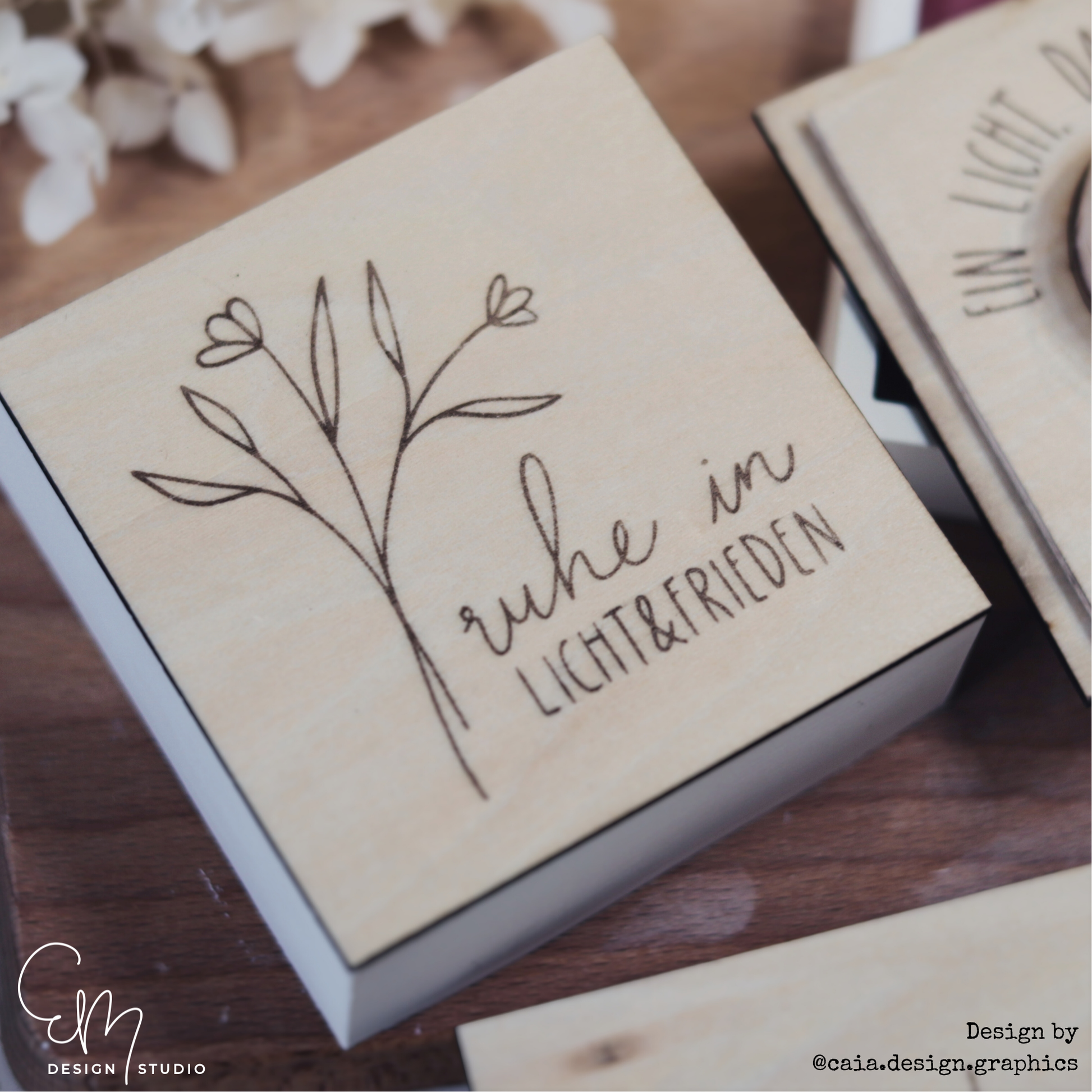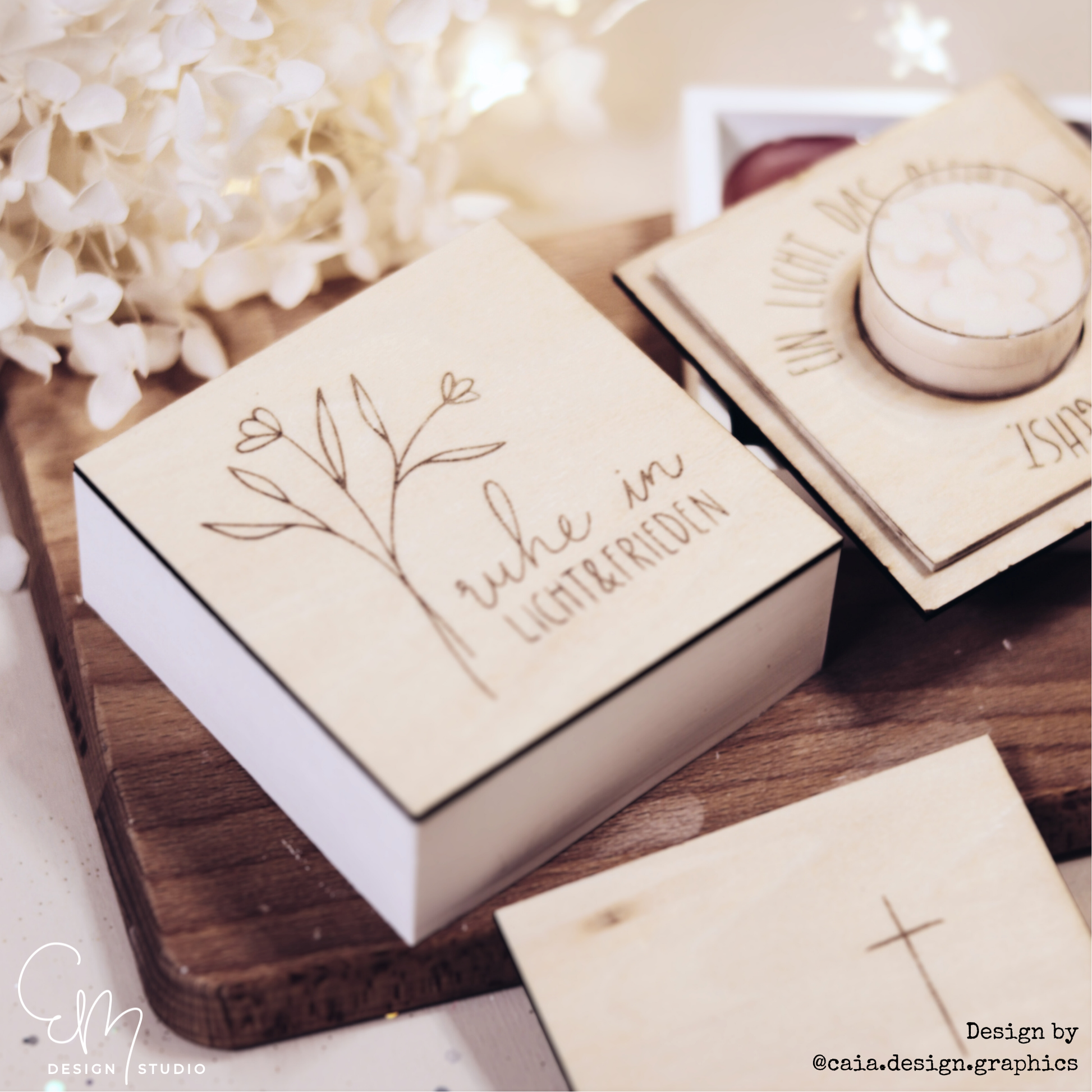 Die Motive sind fein gelasert und wirken durch das helle Holz besonders warm und natürlich. Zarte Schriftzüge, florale Elemente und schlichte Rahmen machen die Deckel zu einem wunderschönen Begleiter für stille Momente, Erinnerungslichter oder kleine Geschenke von Herzen.