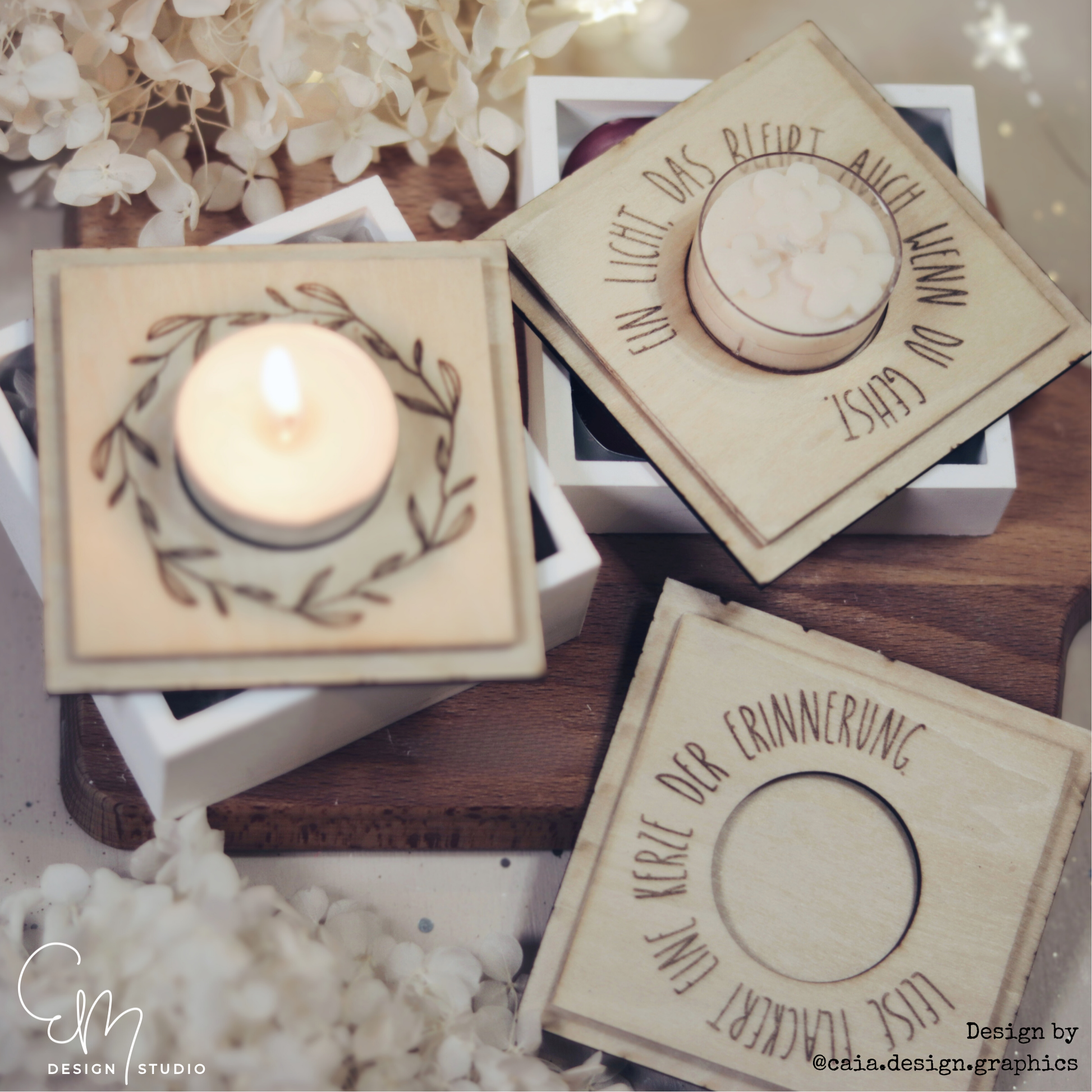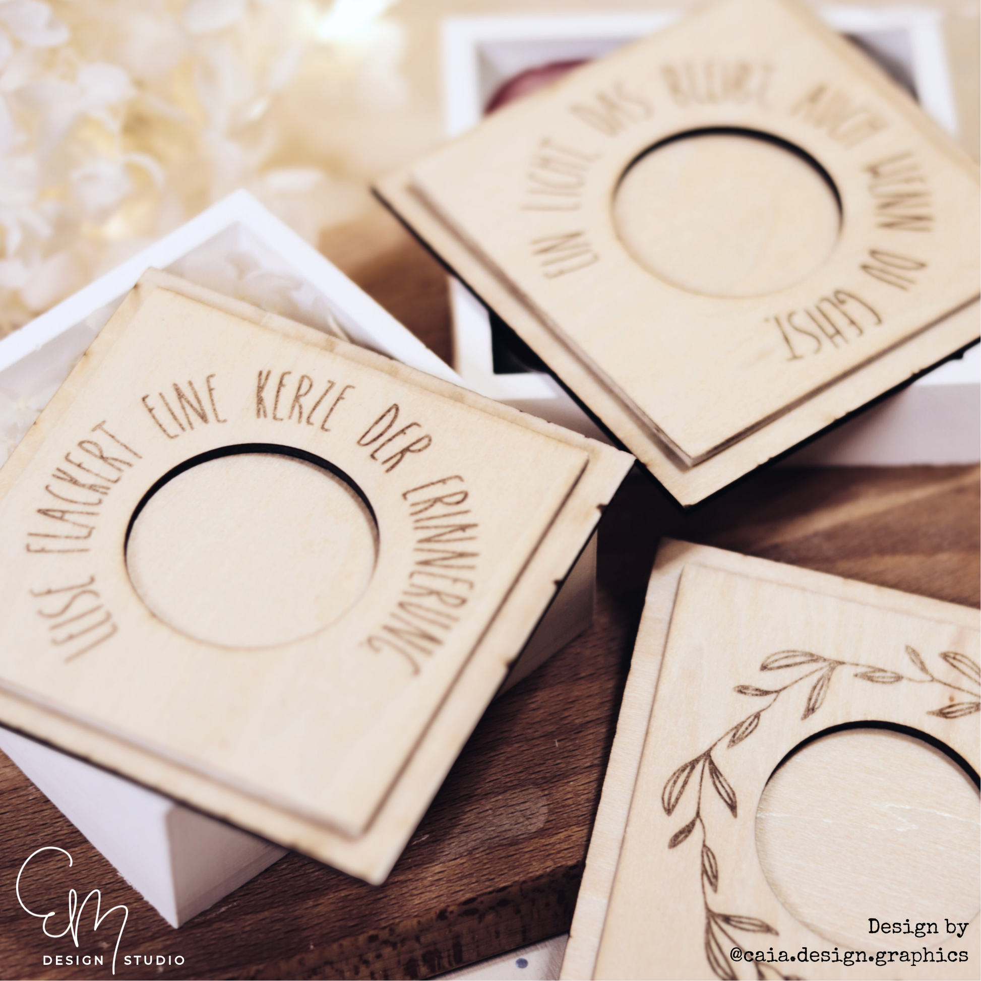 Diese liebevoll gelaserten Deckel sind passend für meine quadratische Teelichtschatulle und verwandeln sie in einen ganz besonderen Kerzenhalter mit ruhiger, zeitloser Ausstrahlung.