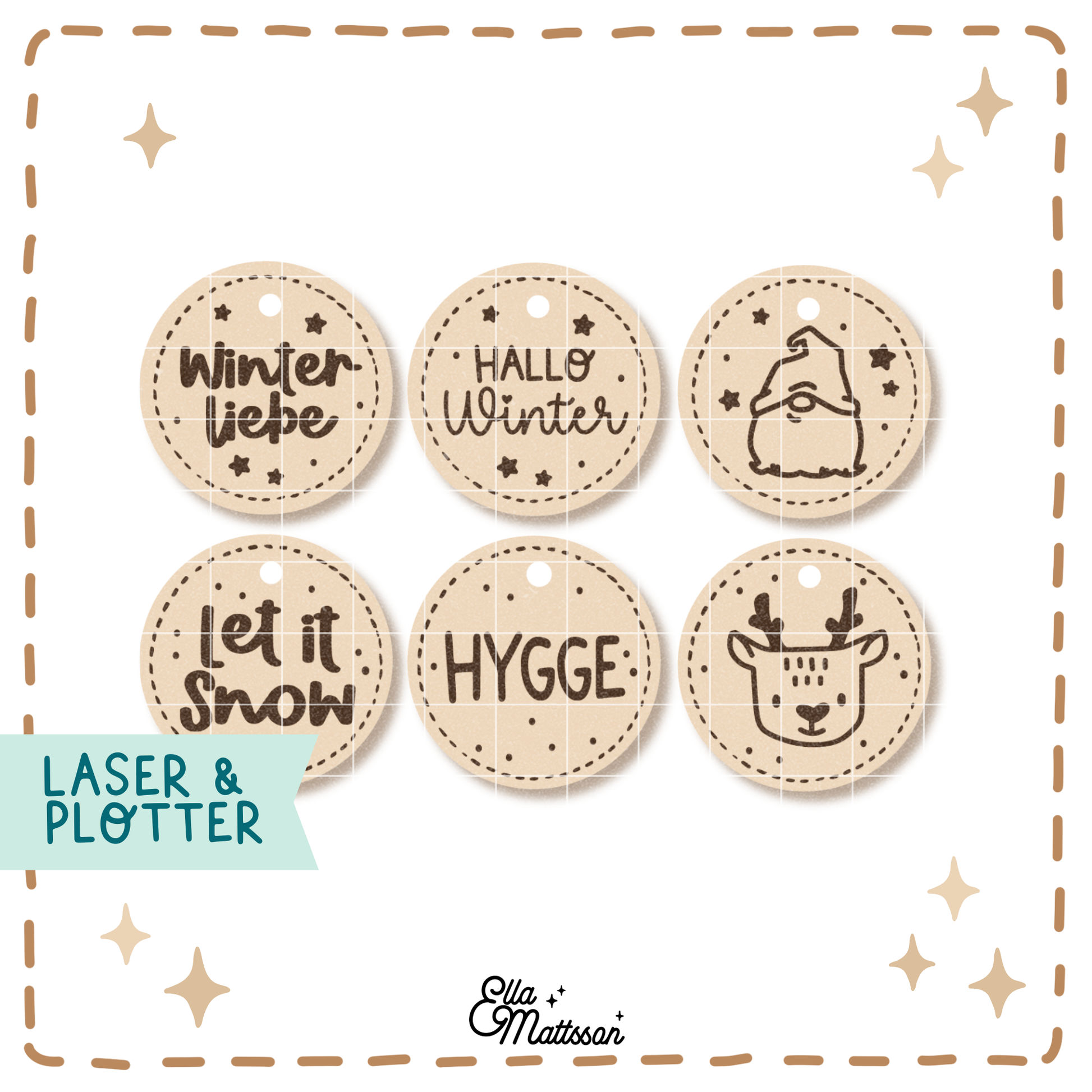 Mit dieser Datei erhältst du ein Set aus sechs winterlichen Anhängern, die du entweder mit deinem Lasercutter oder deinem Plotter herstellen kannst. Die Anhänger sind perfekt geeignet, um Geschenke, Dekoobjekte, Tannenzweige oder gegossene Werke liebevoll zu verzieren.