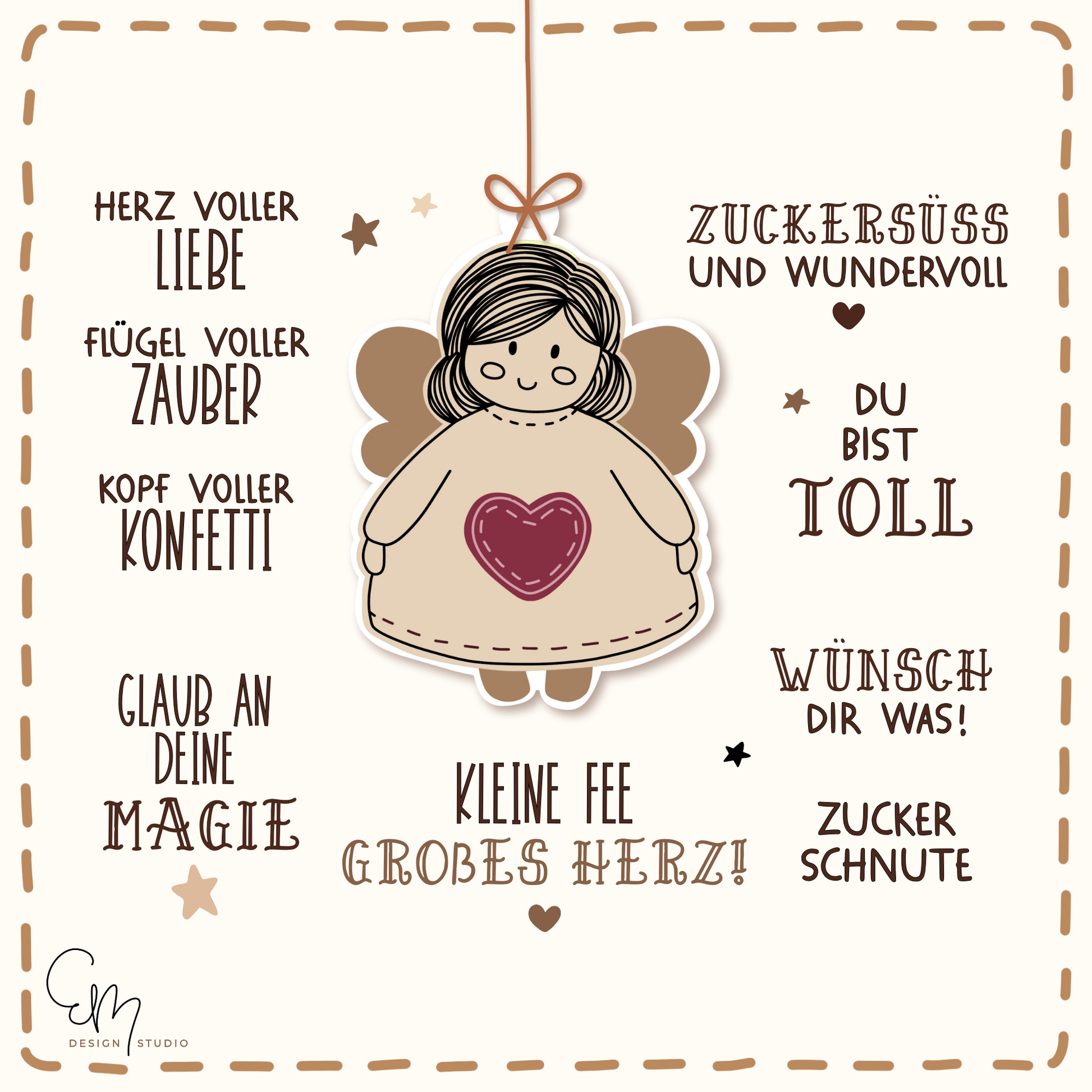 • passende Schriftzüge wie z. B. „Herz voller Liebe“, „Zuckersüß & wundervoll“, „Glaub an deine Magie“ und mehr