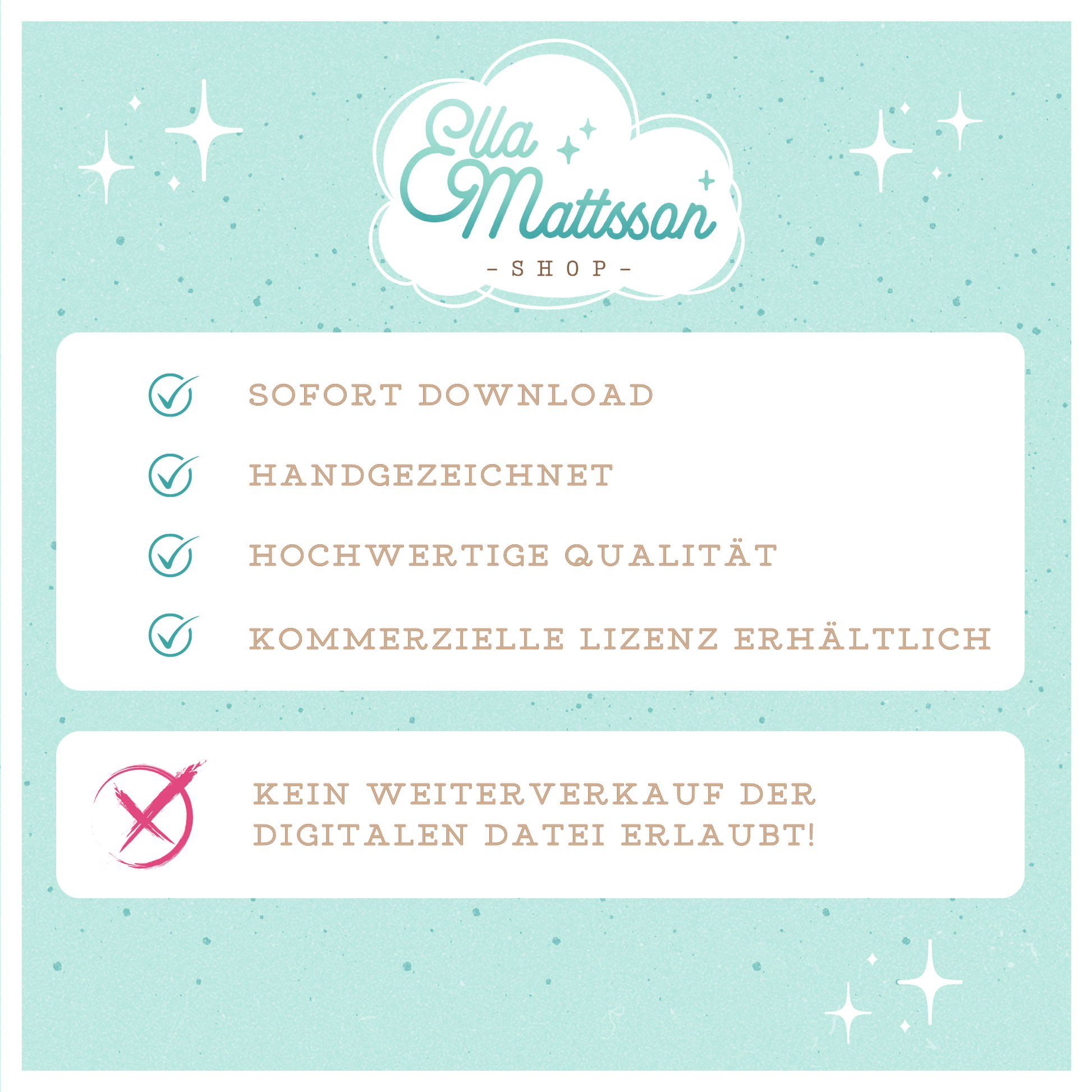- Mit der Lizenz darfst du 100 Exemplare mit meinen Designs darauf verkaufen. Überschreitest Du die 100 Exemplare, musst Du eine Lizenz nachkaufen. Die digitale Datei darf jedoch unter keinen Umständen weiter verkauft oder verteilt werden. Wenn Du noch Fragen dazu hast, lies dir die AGB für Lizenzen durch oder schreibe mir eine Nachricht.