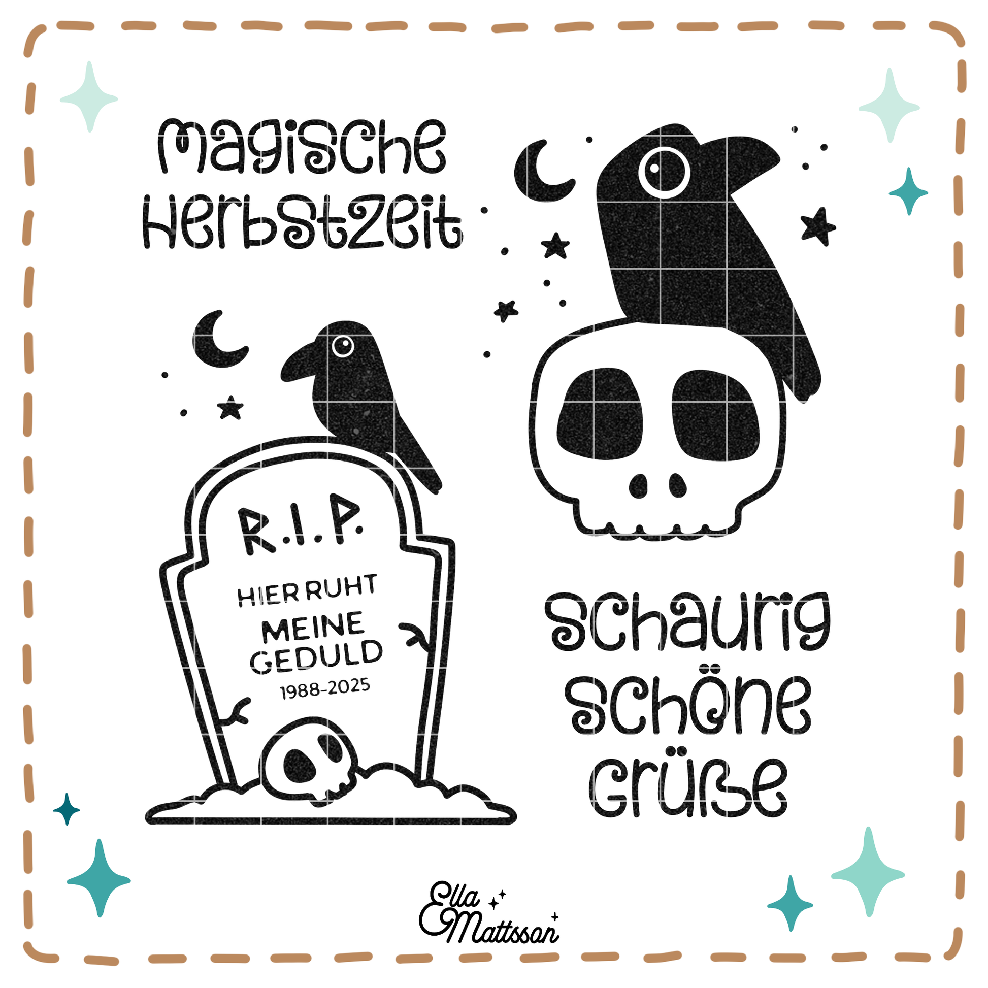 Mit dem Plotterdatei-Bundle „Spooky Raben“ bekommst du eine kleine, aber feine Sammlung handgezeichneter Motive im Halloween-Style – perfekt für gruselige, witzige und kreative Projekte rund um Herbst und All Hallows’ Eve.
