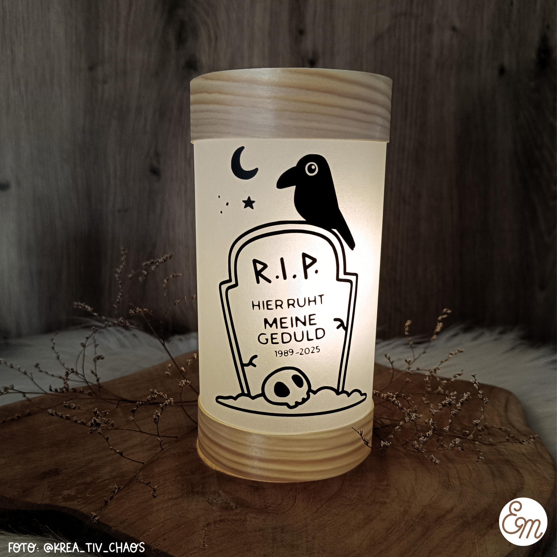 Grabstein mit der Aufschrift „R.I.P. – Hier ruht meine Geduld (1988–2025)“ samt Rabe und Totenkopf