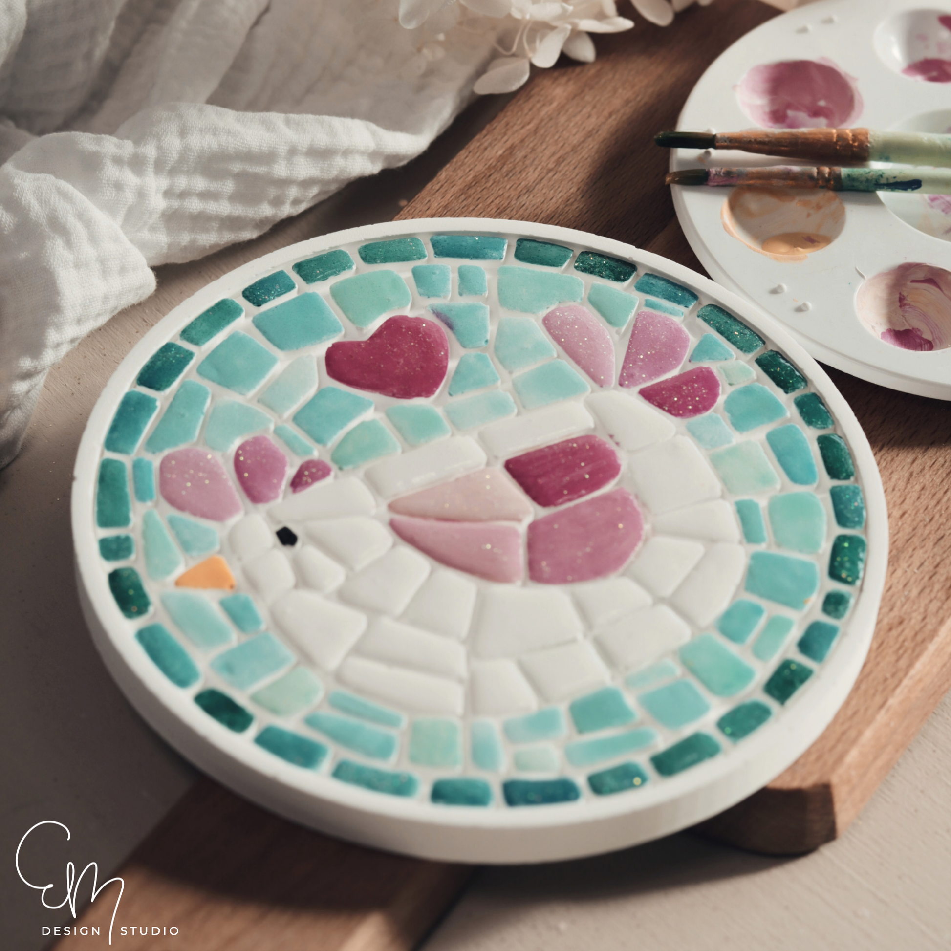 Die einzelnen Mosaiksegmente können ganz nach deinen Vorstellungen bemalt, versiegelt und anschließend verfugt werden. So entsteht Schritt für Schritt ein einzigartiges Kunstwerk in deinen Lieblingsfarben – von zarten Pastelltönen bis hin zu kräftigen Kontrasten.