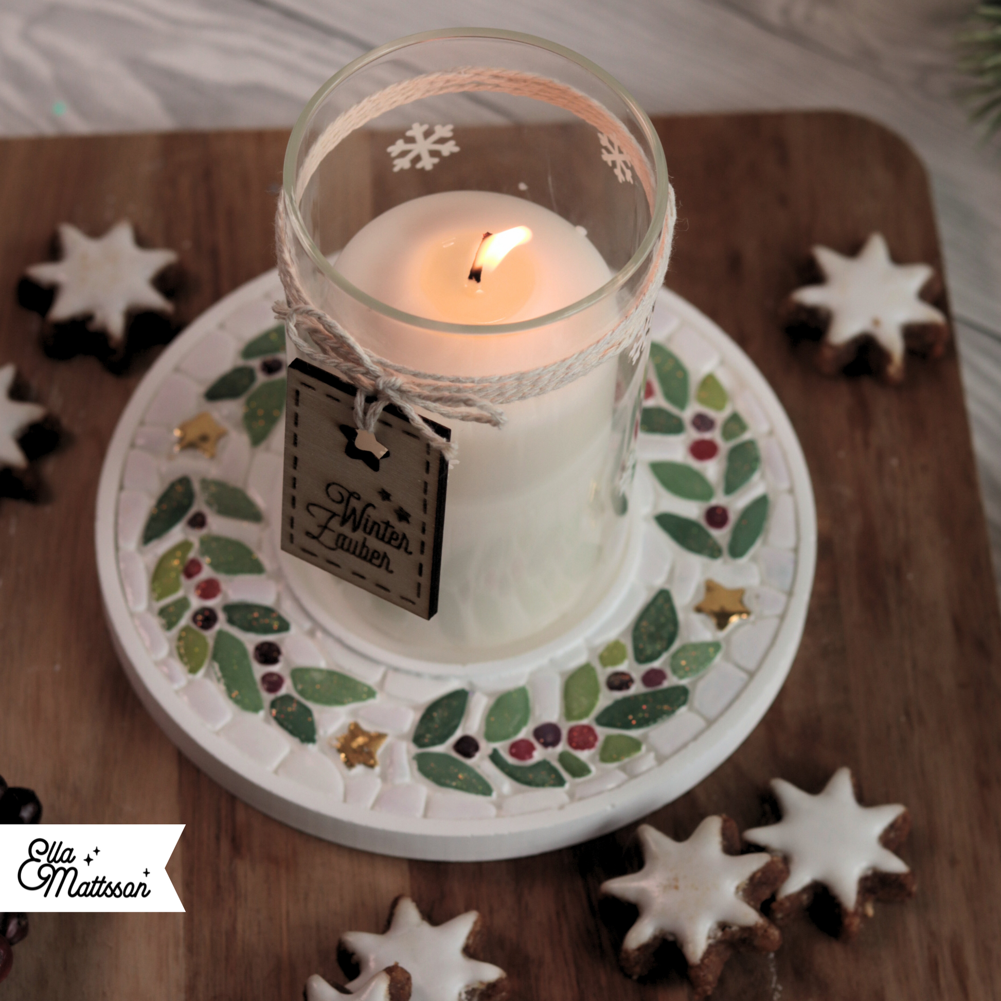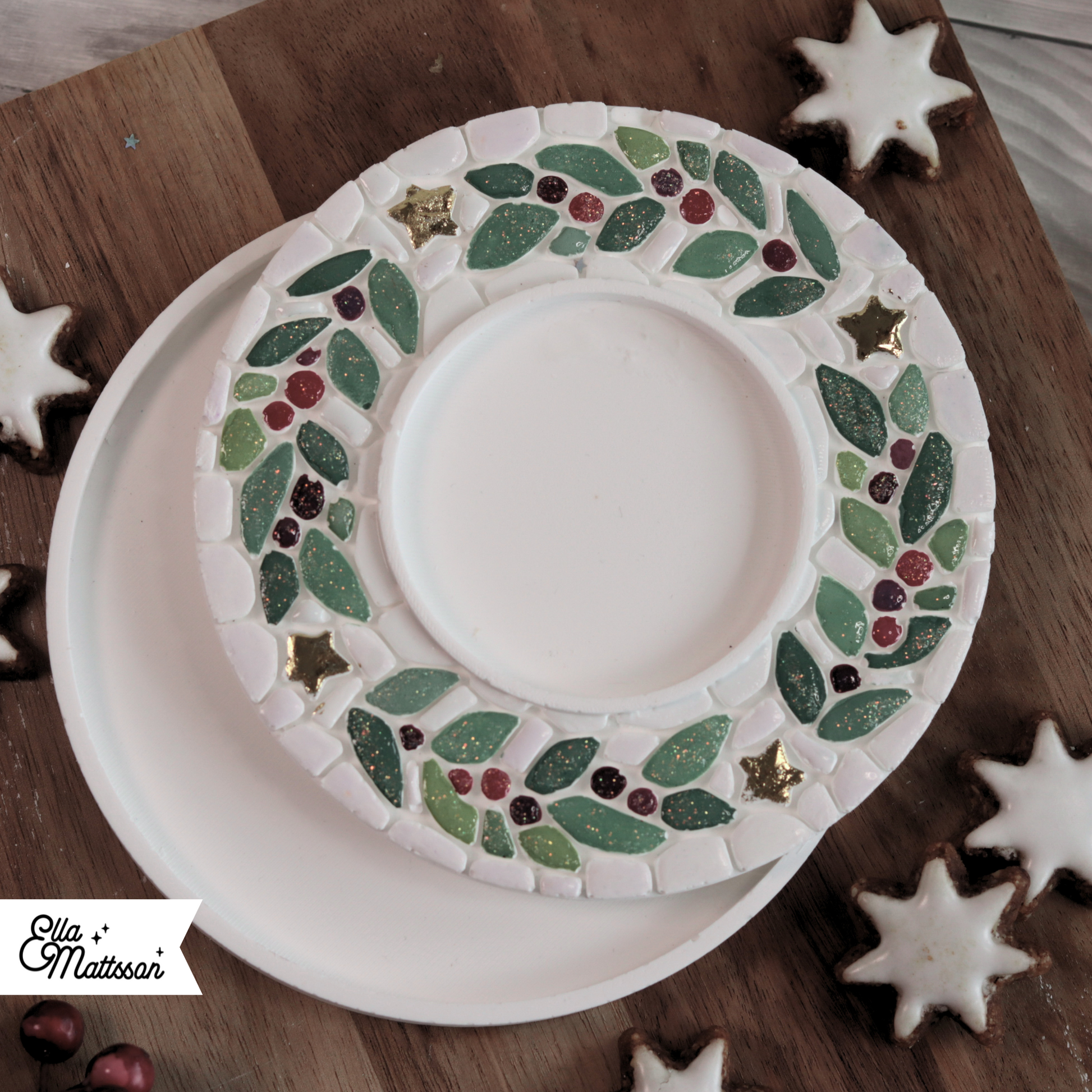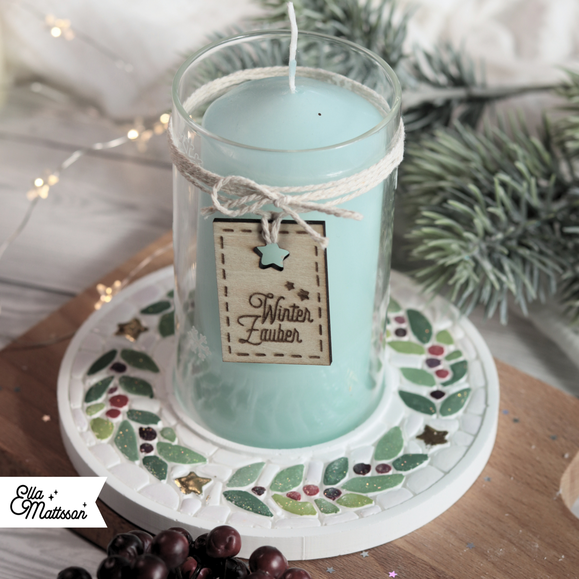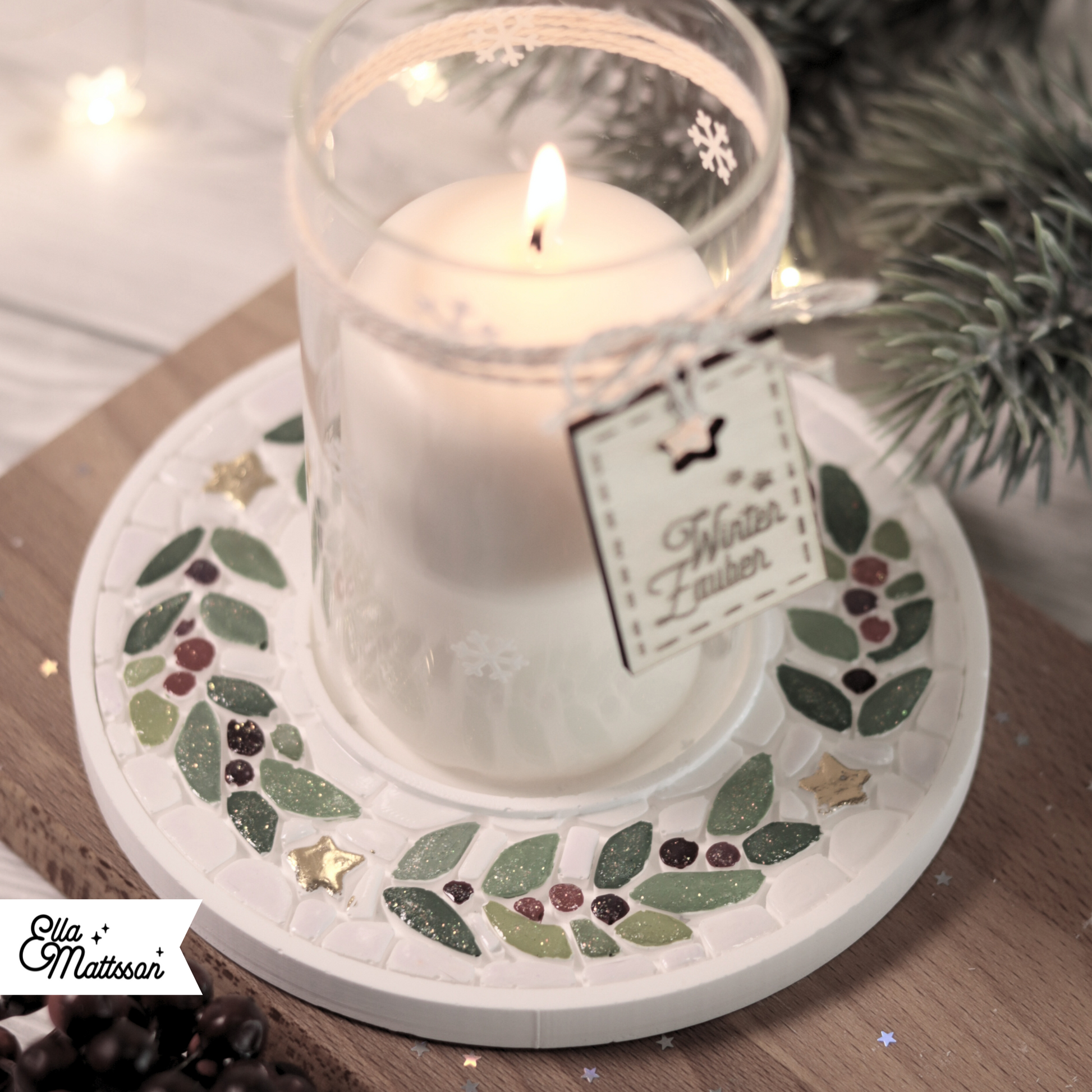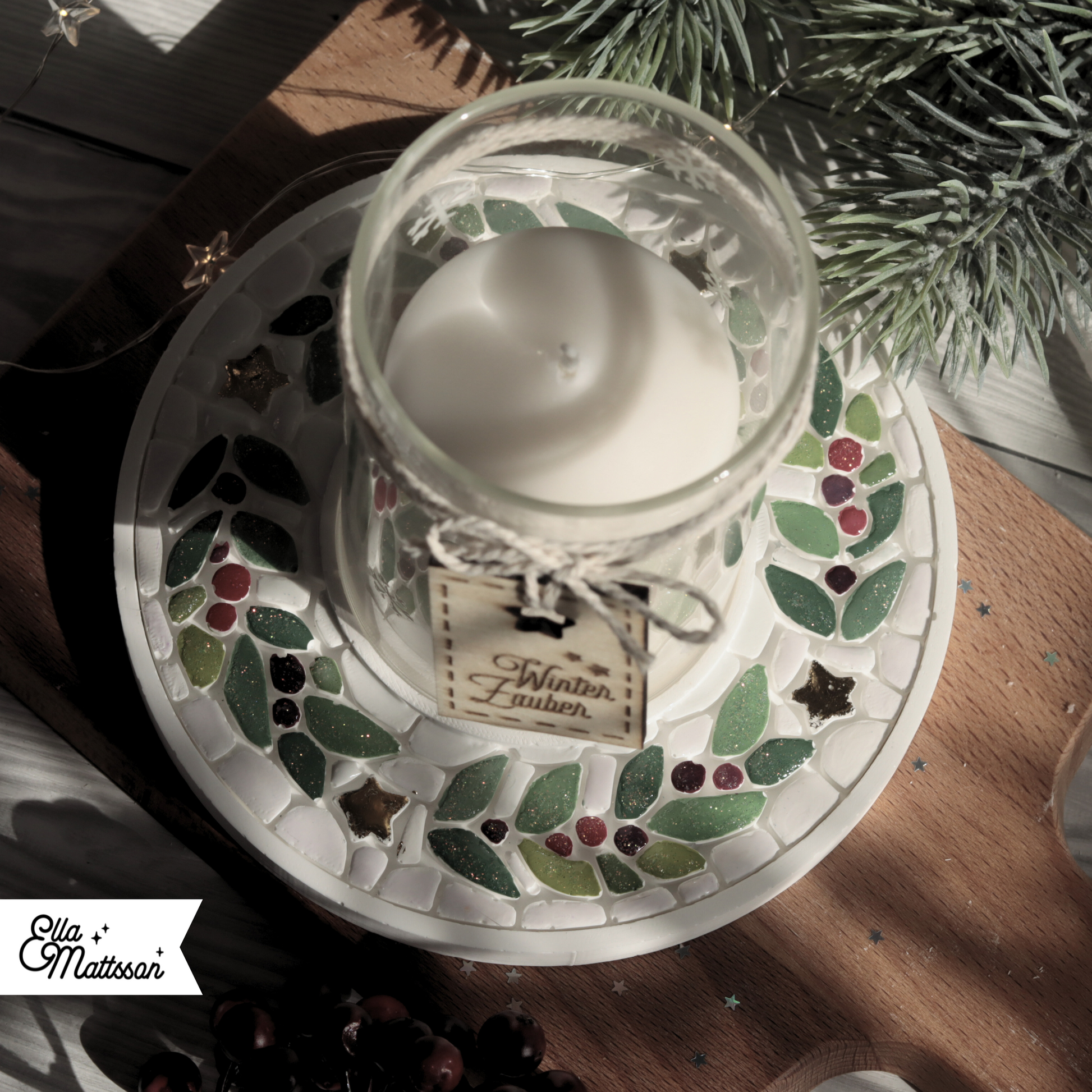 Mit der handgefertigten Silikonform „Winterbeeren-Lichtteller“ gießt du einen dekorativen Mosaikteller in der neuen Größe M (Durchmesser ca. 14 cm). In der Mitte befindet sich eine runde Vertiefung, in die eine Stumpenkerze oder ein Glas mit einem Durchmesser von bis zu 7 cm perfekt hineinpasst. So entsteht eine stimmungsvolle Lichtdekoration, die sich vielseitig einsetzen lässt – ob zur Adventszeit oder als ganzjähriges Arrangement.