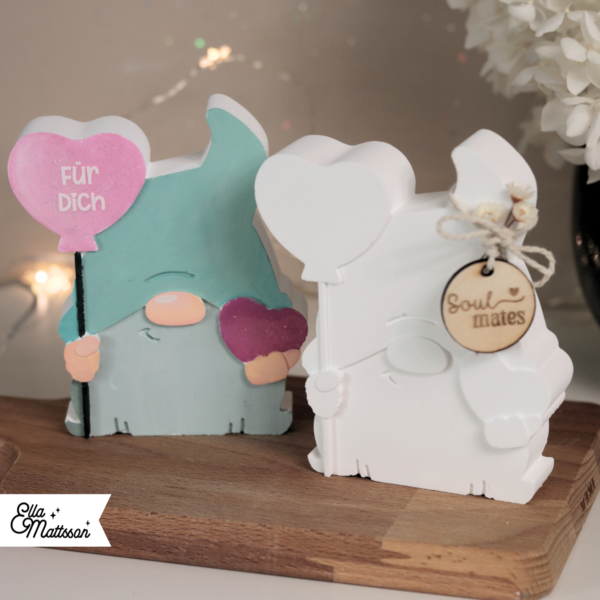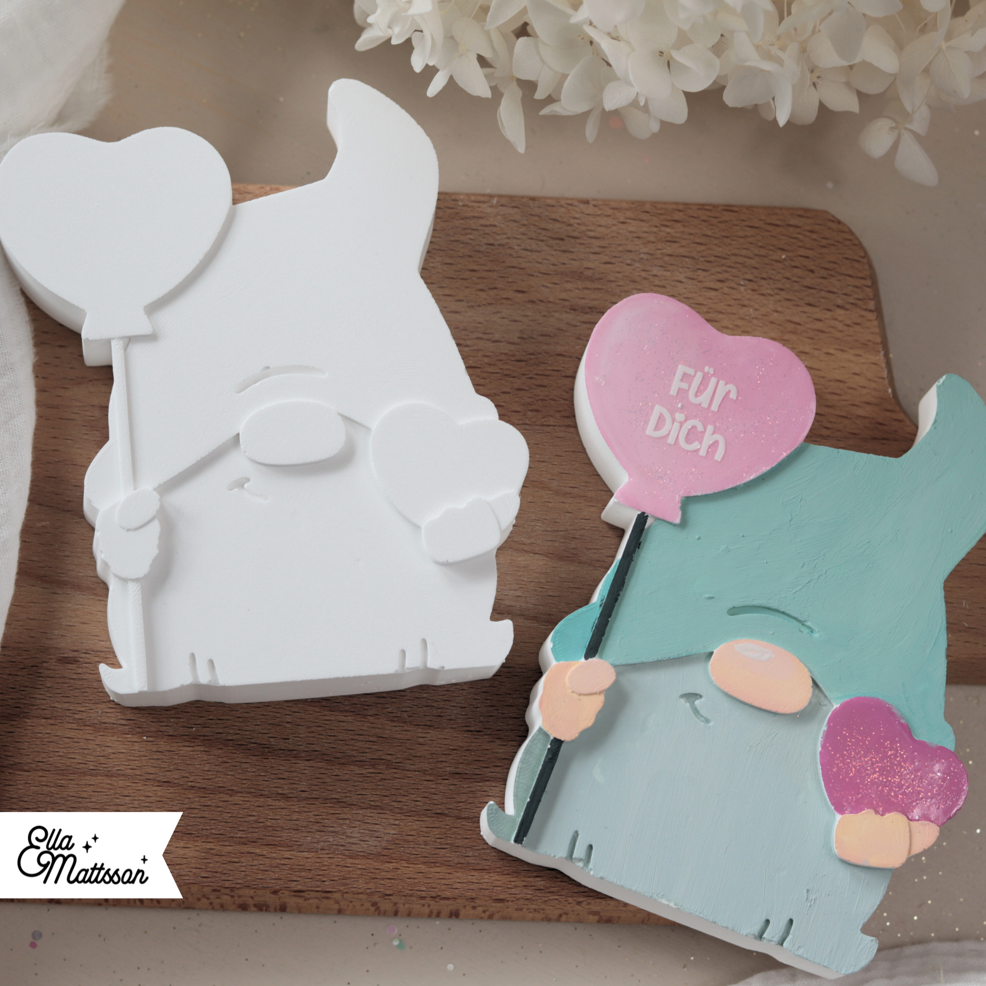 Mit der handgemachten Silikonform „Wichtel mit Herzballon“ gießt du eine zauberhafte Dekofigur zum Hinstellen. Der kleine Wichtel hält in der einen Hand einen Luftballon in Herzform und in der anderen ein weiteres Herz – das du nach Belieben kreativ interpretieren kannst, z. B. als kleine Pralinenschachtel oder als schlichtes Herzsymbol.