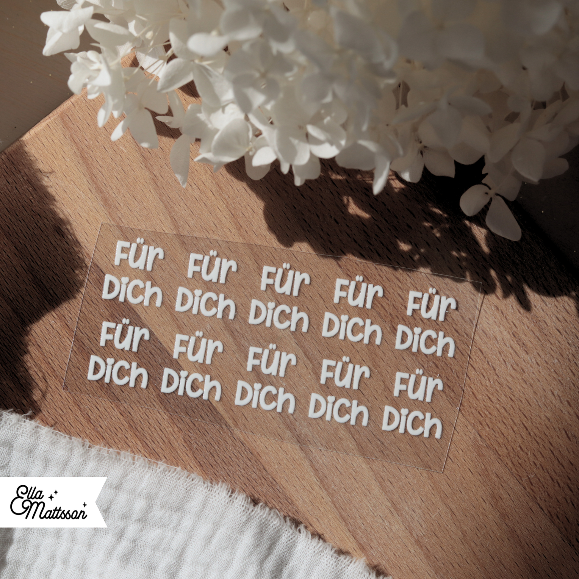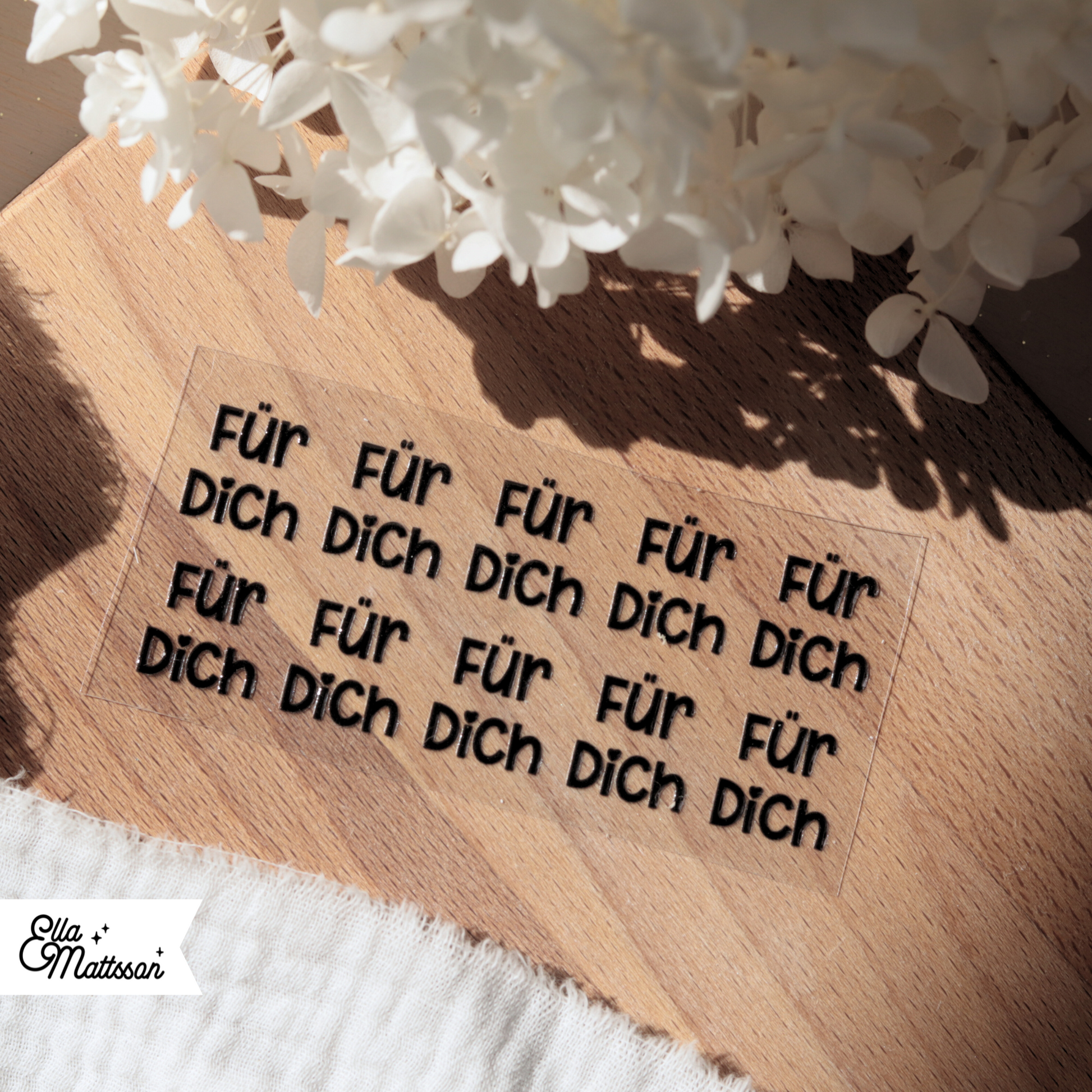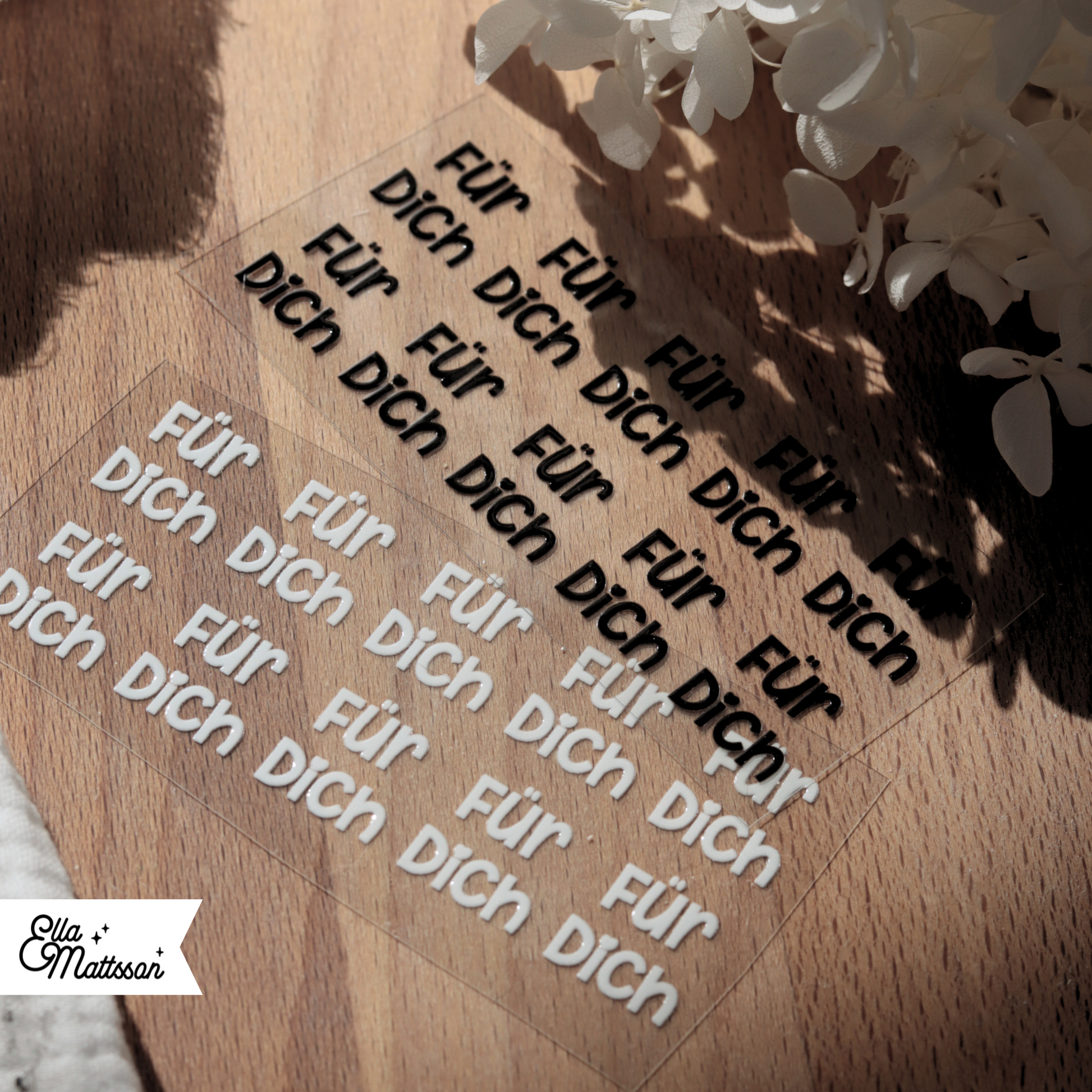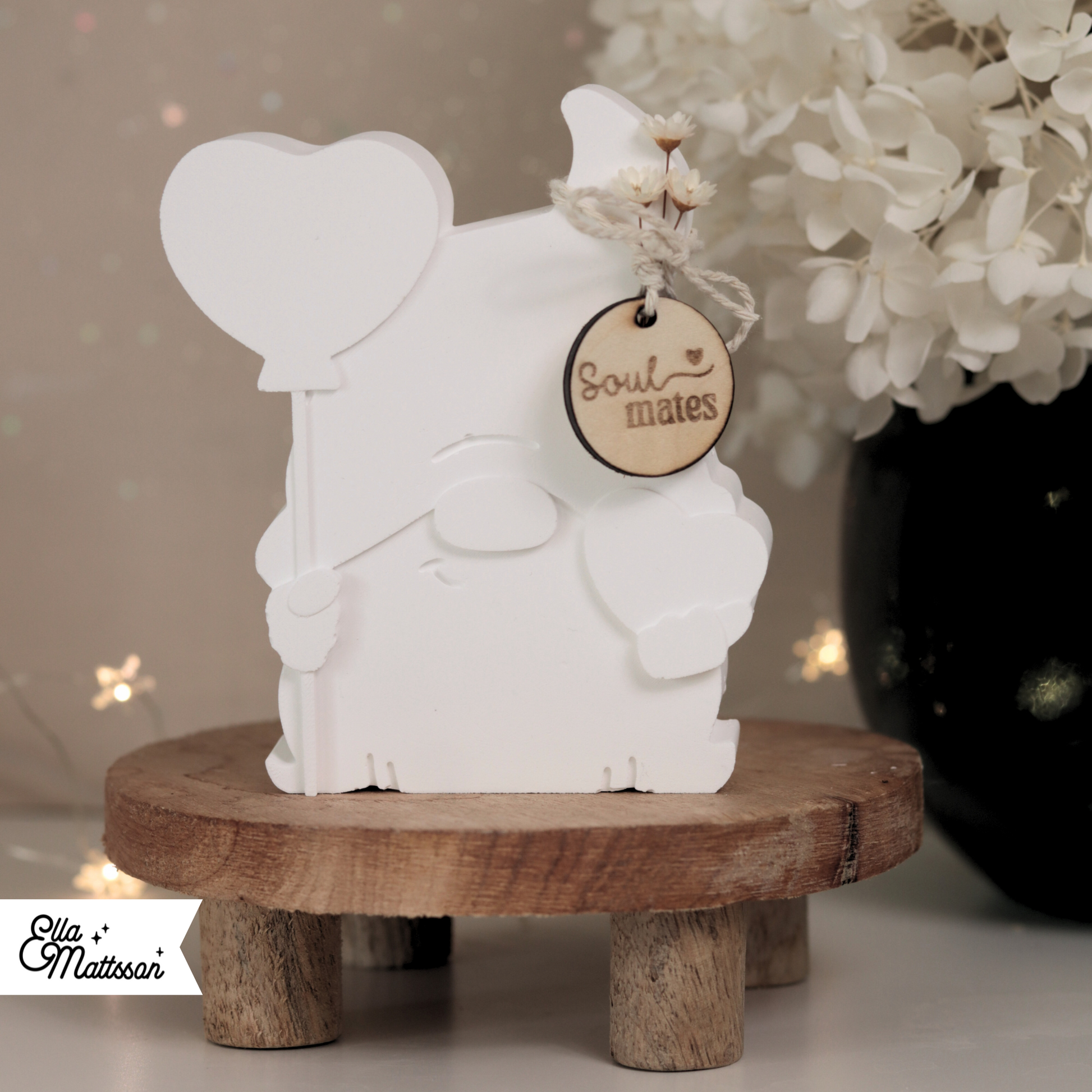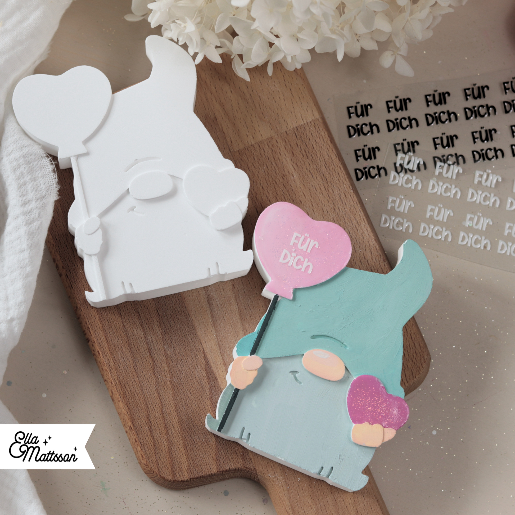 Besonders schön: Passend zu dieser Figur gibt es Rub-On Sticker, die exakt auf den Herzballon passen. Auf einem kleinen Bogen findest du jeweils 10 Schriftzüge in Schwarz und 10 in Weiß. Diese Sticker sind separat im Shop erhältlich und machen deinen Wichtel zu einem echten Unikat.