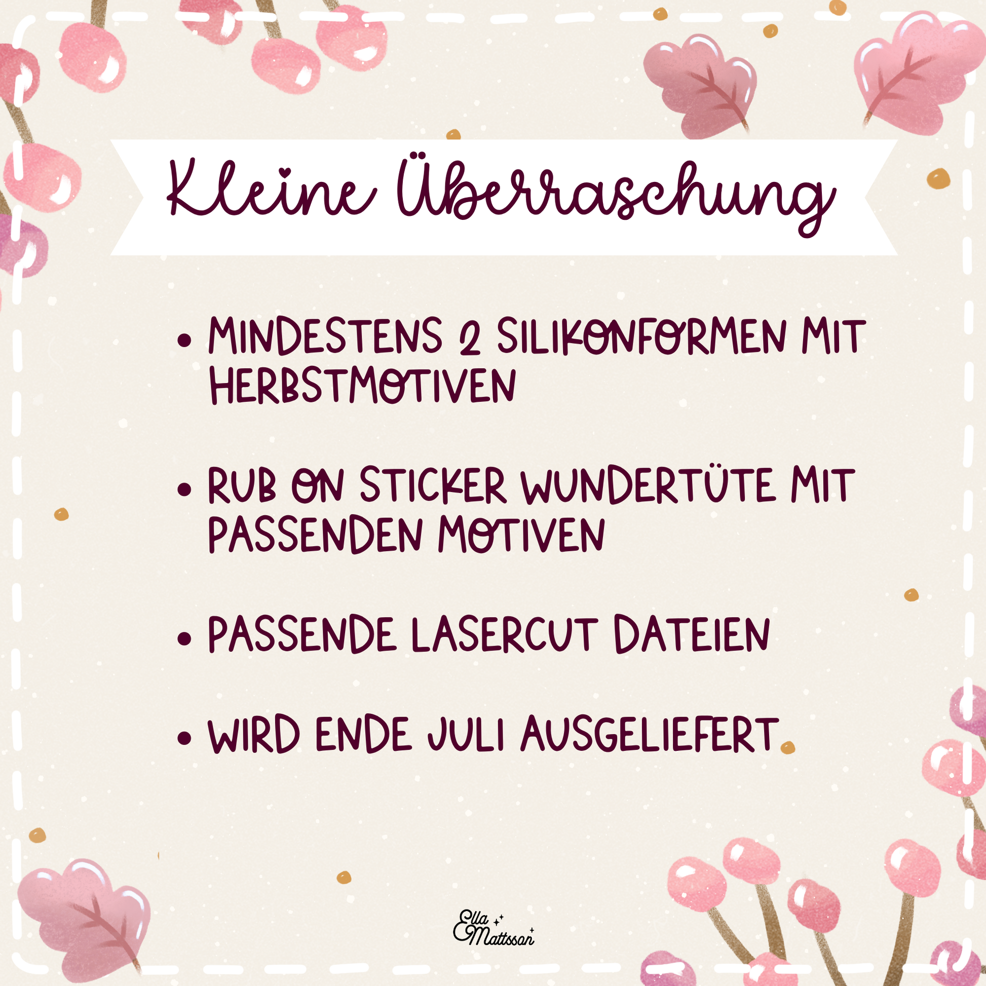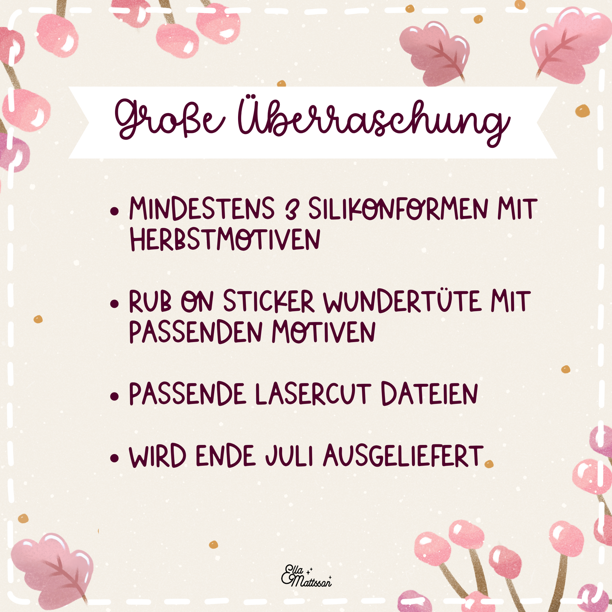 Wird Ende Juli versendet! Du erhältst eine Wundertüte mit unveröffentlichten und neuen herbstlichen Silikonformen + GRATIS passende Lasercut Dateien UND Rub on Sticker und kannst damit auch noch über 10% sparen! Wähle zwischen 2 Größen: